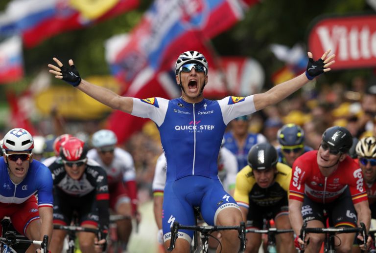 Nemecký cyklista Marcel Kittel z tímu Quick-Step Floors sa teší z triumfu v 2. etape 104. ročníka Tour de France, ktorá viedla z Düsseldorfu do Liége. Liége, 2. júl 2017. Foto: SITA/AP.