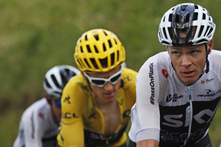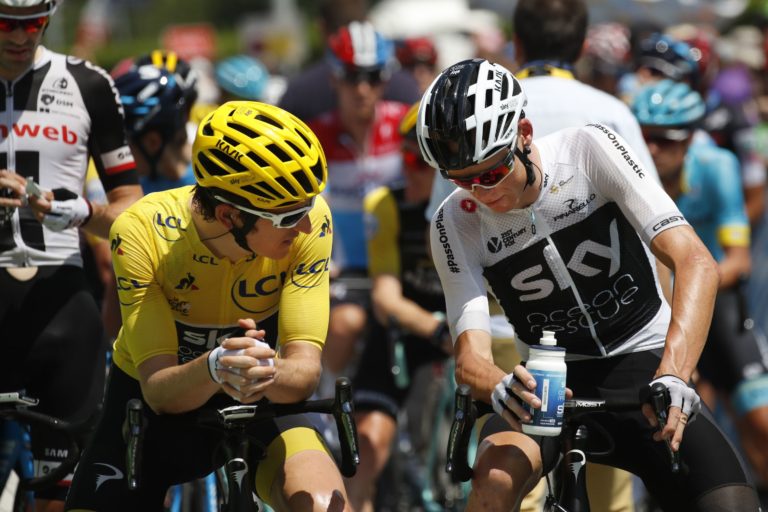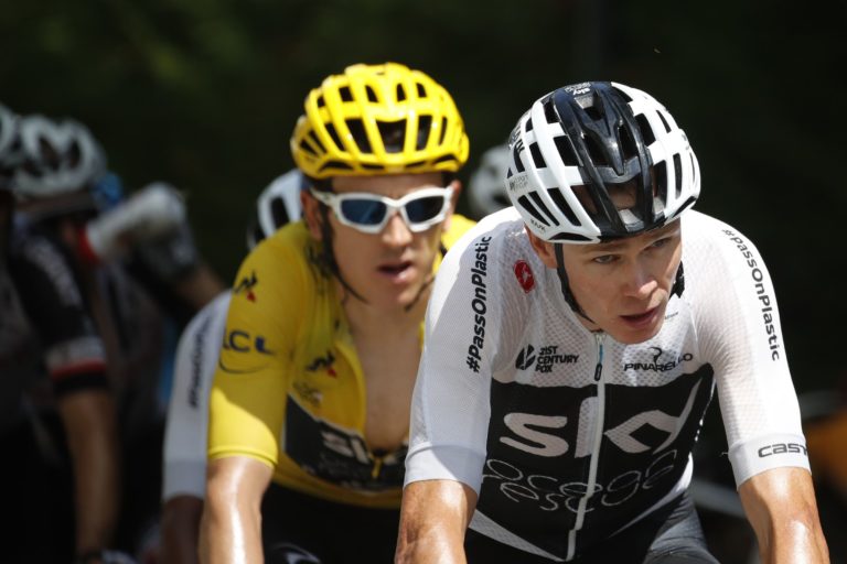 Zľava: Geraint Thomas v žltom drese a Chris Froome, obaja z tímu Sky, počas 17. etapy Tour de France. 25. júl 2018 Foto: SITA/AP