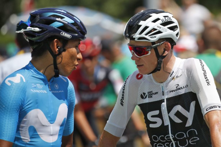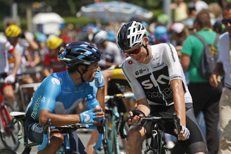 Zľava: Nairo Quintana z Kolumbie a Chris Froome z Veľkej Británie pred štartom 17. etapy Tour de France. 25. júl 2018 Foto: SITA/AP
