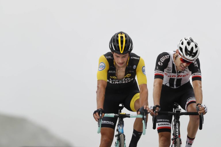 Zľava: Slovinec Primož Roglič a Holanďan tom Dumoulin po príchode do cieľa 17. etapy tour de France. 25. júl 2018 Foto: SITA/AP