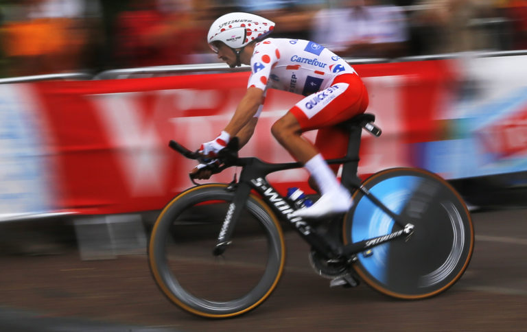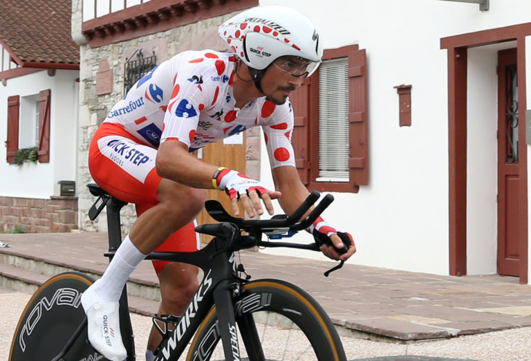 Francúz Julian Alaphilippe v bodkovanom drese lídra súťaže vrchárov počas 20. etapy Tour de France 2018, ktorou bola individuálna časovka na 31 km zo Saint-Pée-sur-Nivelle do Espelette. Foto: SITA/AP.