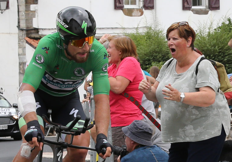 Slovenský cyklista Peter Sagan v zelenom drese lídra bodovacej súťaže počas 20. etapy Tour de France 2018, ktorou bola individuálna časovka na 31 km zo Saint-Pée-sur-Nivelle do Espelette.