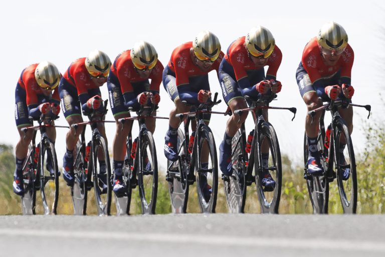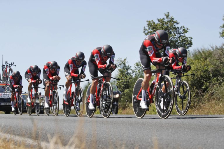 Tím Bahrein-Merida s Talianom Vincenzom Nibalim počas 3. etapy Tour de France 2018. 9. júl 2018 Foto: SITA/AP