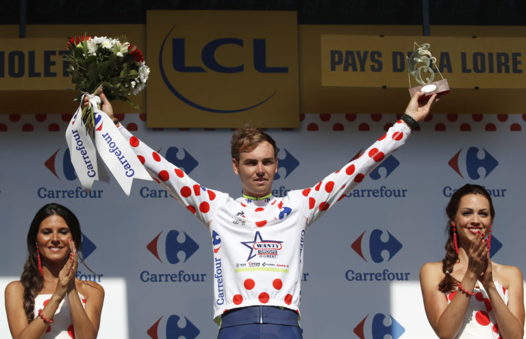 Novzélanďan Dion Smith na stupňoch pre víťazov v bodkovanom drese lídra súťaže vrchárov po 3. etape Tour de France 2018, ktorou bola časovka tímov na 35,5 km. Foto: SITA/AP.