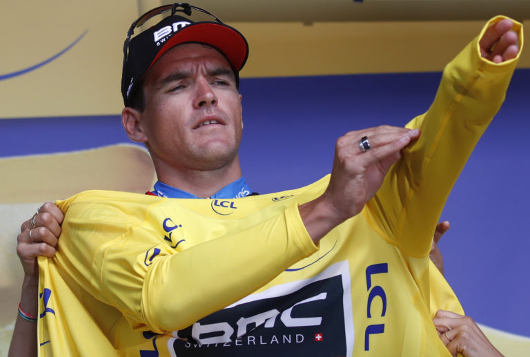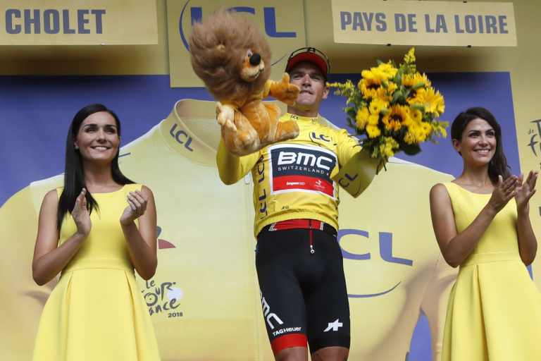 Belgičan Greg van Avermaet v žltom drese lídra pretekov po 3. etape Tour de France 2018, ktorou bola časovka tímov na 35,5 km. Foto: SITA/AP.