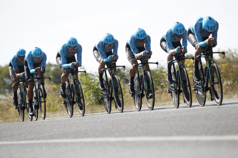 Cyklisti Astany počas 3. etapy Tour de France, ktorou bola časovka družstiev na 35,5 km. Foto: SITA/AP.