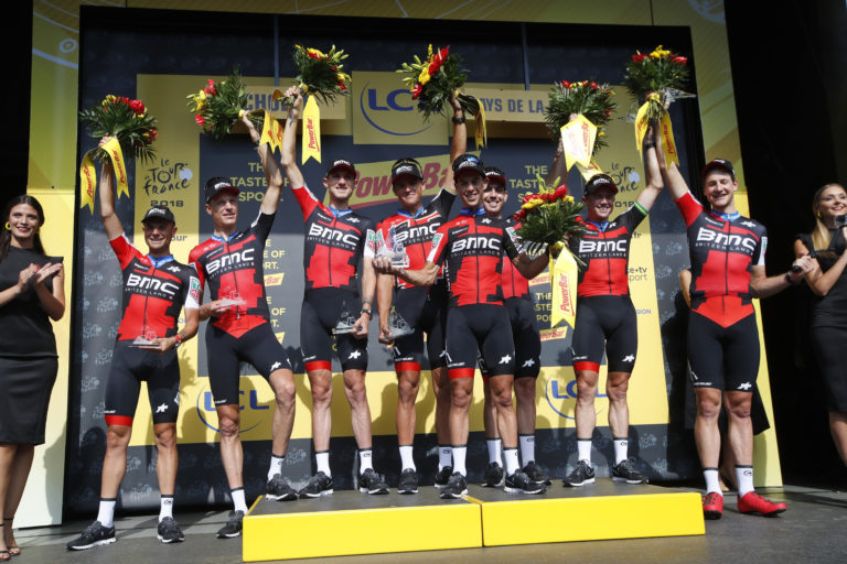 Tím BMC Racing, ktorý zvíťazil v časovke 3. etapy Tour de France 2018. 9. júl 2018 Foto: SITA/AP