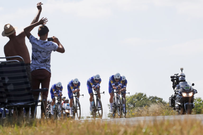 Cyklisti Quick Step Floors počas 3. etapy Tour de France, ktorou bola časovka družstiev na 35,5 km. Foto: SITA/AP.