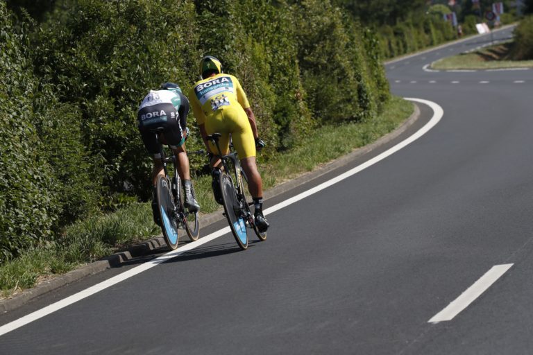 Slovenský cyklista Peter Sagan v žltom drese lídra Tour de France s kolegom z tímu Bora-Hansgrohe Macusom Burghardtom počas 3. etapy 105. ročníka "starej dámy", ktorou bola časovka na 35,5 kilometra. Foto: SITA/AP.