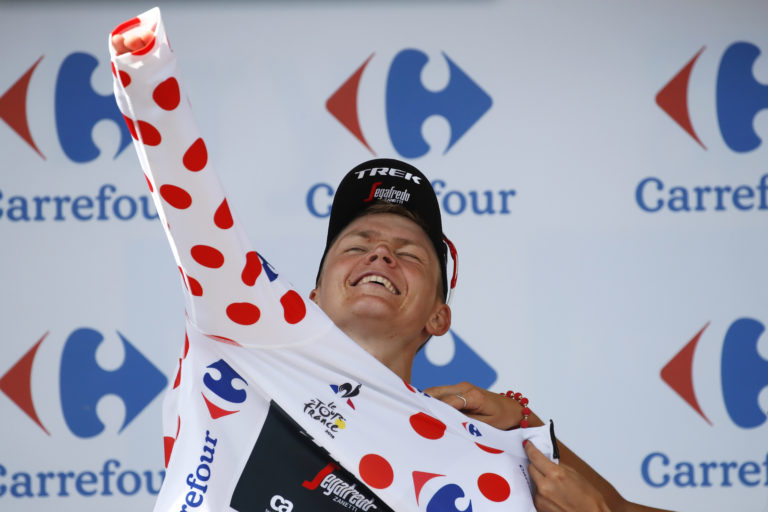 Lotyš Toms Skujins si oblieka bodkovaný dres lídra súťaže vrchárov na stupňoch pre víťazov Belgický cyklista Greg Van Avermaet v žltom drese lídra pretekov na stupňoch pre víťazov po 5. etape Tour de France 2018 z Lorient do Quimper (204,5 km). 11. júl 2018. Foto: SITA/AP.