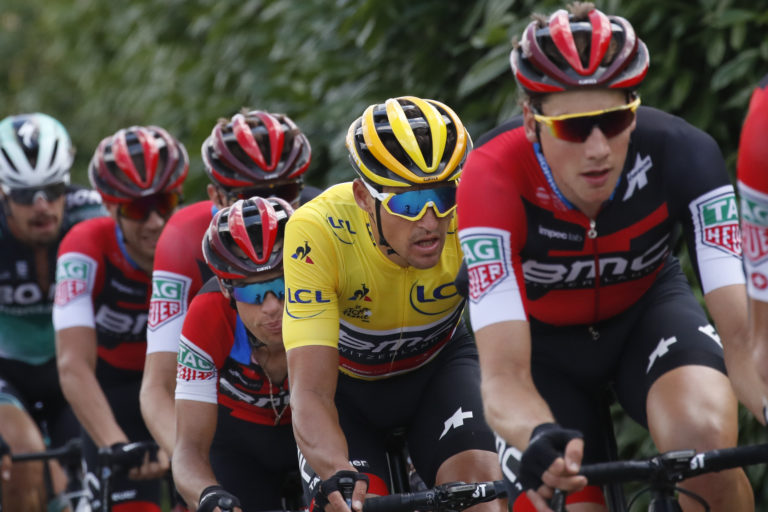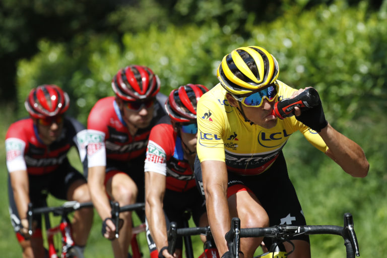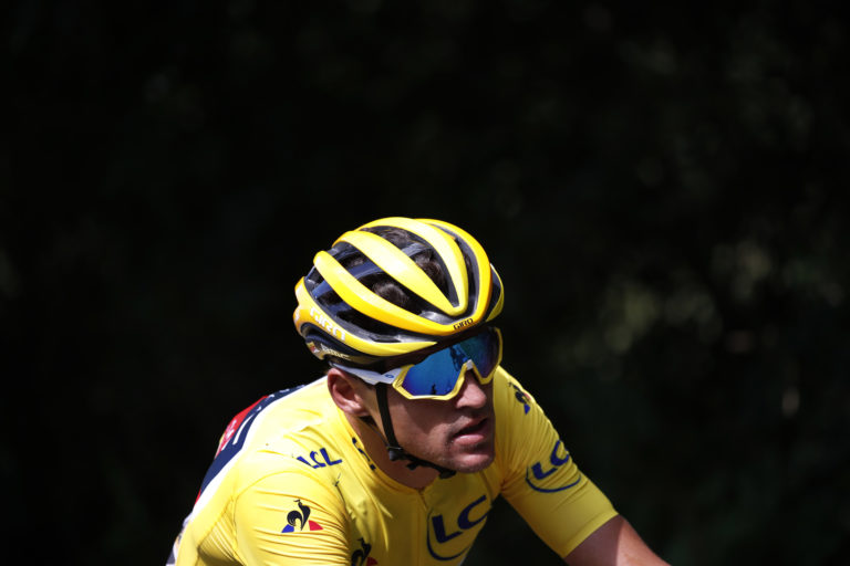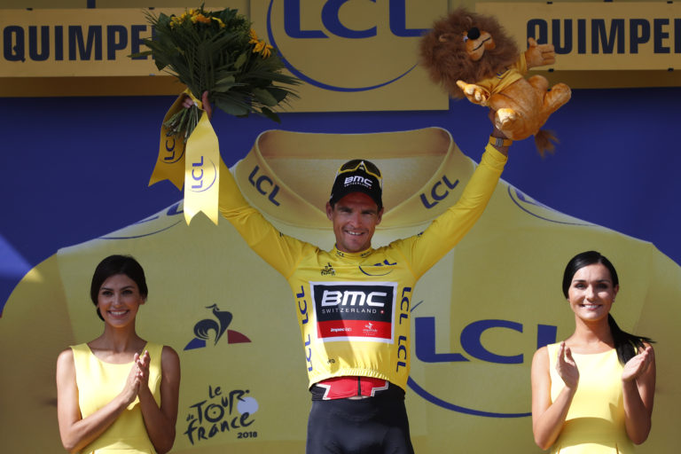 Belgičan Greg van Avermaet v žltom drese lídra počas 5. etapy Tour de France 2018 z Lorient dp Quimper (204,5 km). 11. júl 2018. Foto: SITA/AP.