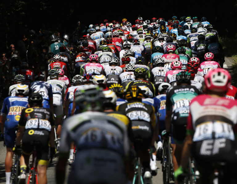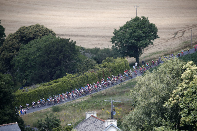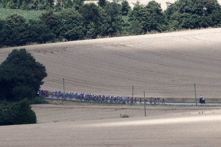 The pack passes wheat fields during the fifth stage of the Tour de France cycling race over 204.5 kilometers (127 miles) with start in Lorient and finish in Quimper, France, Wednesday, July 11, 2018. (AP Photo/Christophe Ena) Foto: SITA/AP.