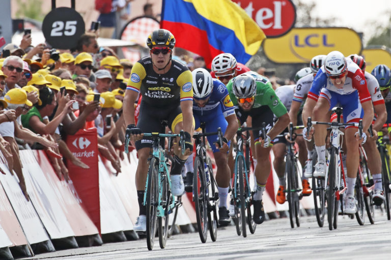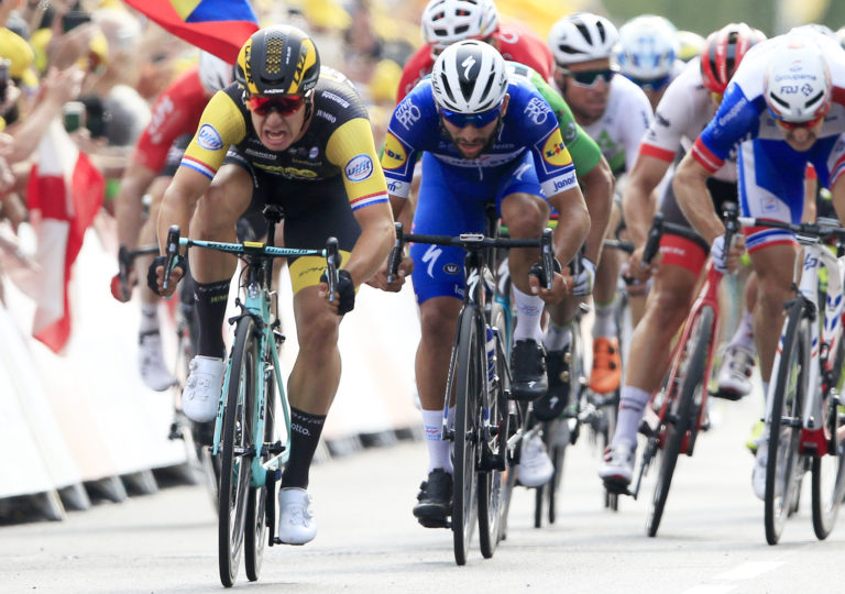 Víťazom siedmej etapy 105. ročníka Tour de France 2018 sa stal Holanďan Dylan Groenewegen, slovenský cyklista Peter Sagan (v zelenom) obsadil tretie priečku. Chartres, 13. júl 2018. Foto: SITA/AP.
