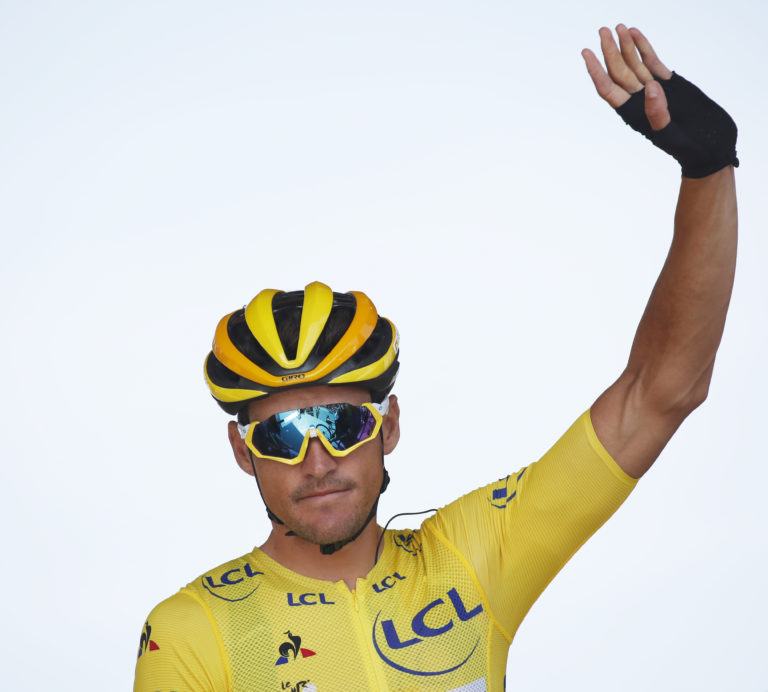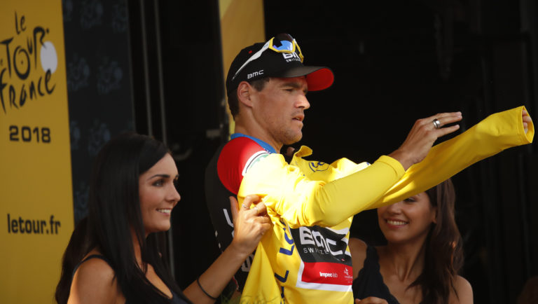 Belgičan Greg Van Avermanet si na stupňoch pre víťazov oblieka žltý dres lídra po siedmej etape 105. ročníka Tour de France z Fougéres do Chartres (231 km). Foto: SITA/AP.