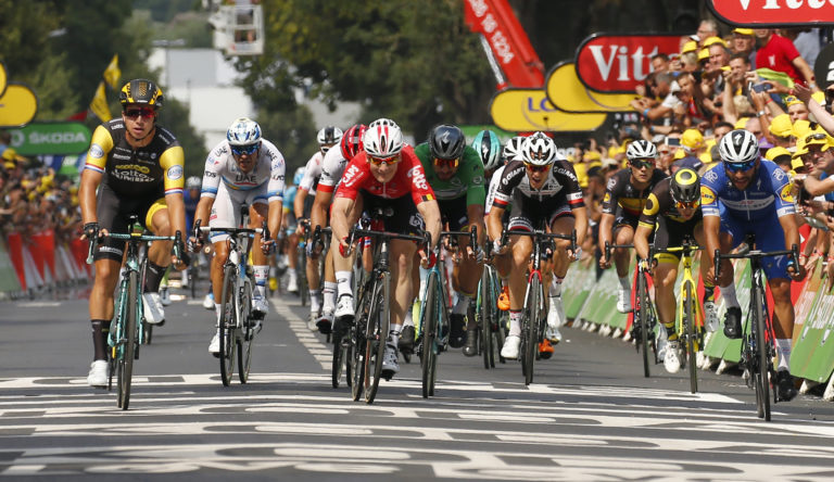Súboj o triumf v 8. etape 105. ročníka Tour de France vyhral Dylan Groenewegen (vľavo). Foto: SITA/AP.