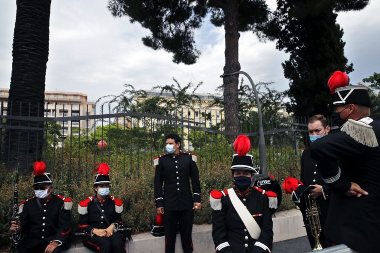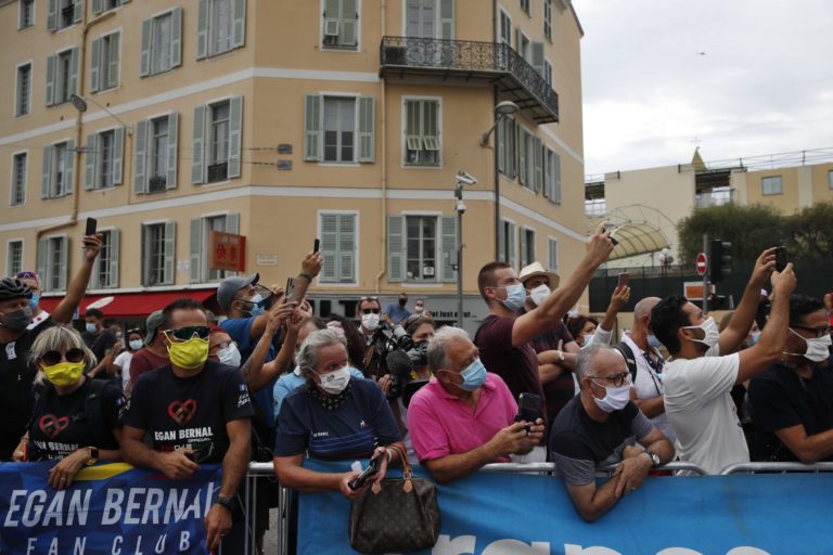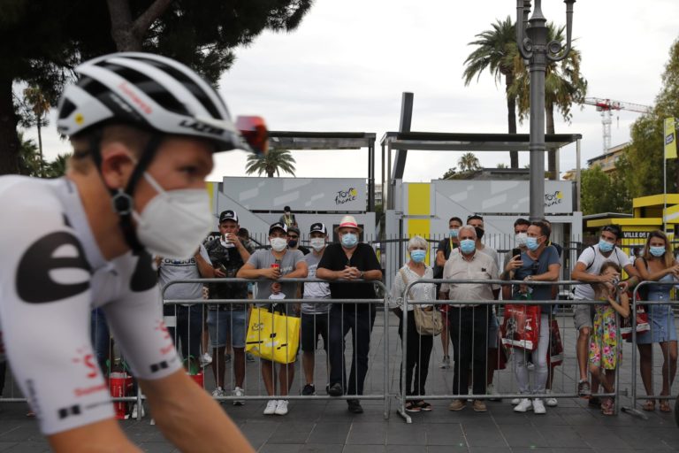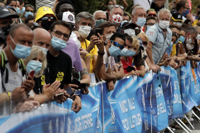 Fanúšikovia v rúškach pred štartom 1. etapy Tour de France 2020. 29. august 2020 Foto: SITA/AP