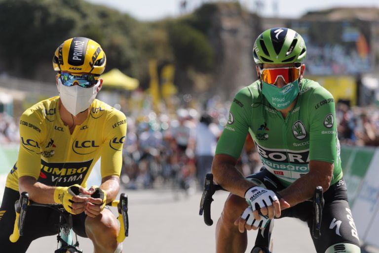 Primož Roglič, vľavo, a Peter Sagan v zelenom drese lídra bodovacieho poradia čakajú na odštartovanie 10. etapy Tour de France 2020. 8. september 2020