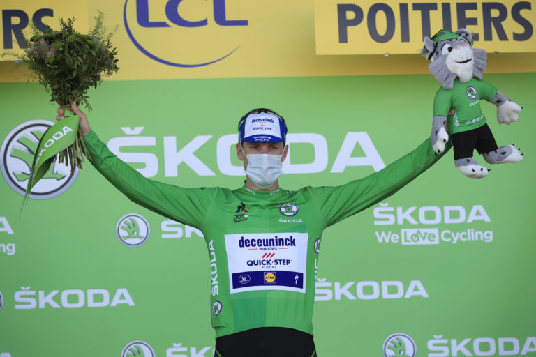 Írsky cyklistaSam Bennett v zelenom drese lídra bodovacej súťaže na pódiu po 11. etape Tour de France 2020 zo Châtelaillon-Plage do Poitiersu (167,5 km). Poitiers, 9. september 2020. Foto: Christophe Petit-Tesson/Pool via AP.