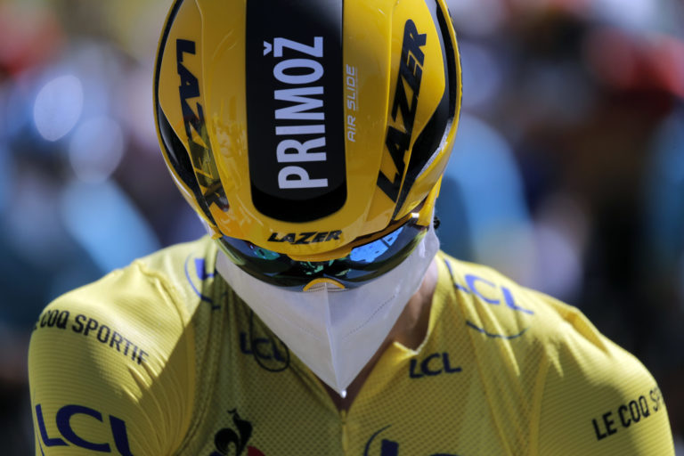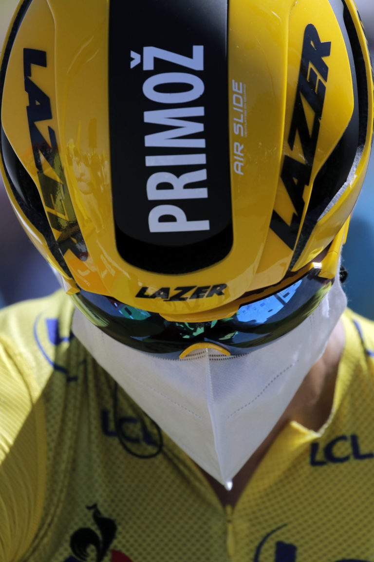 Slovinský cyklista Tadej Pogacar pred štartom 11. etapy Tour de France 2020 zo Châtelaillon Plage do Poitiersu (167,5 km). Châtelaillon Plage, 9. september 2020. Foto: Anne Christine Poujoulat/Pool via AP.