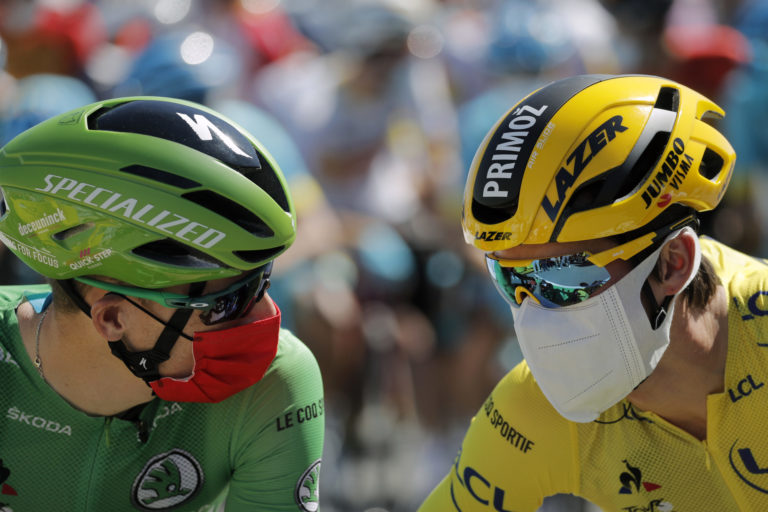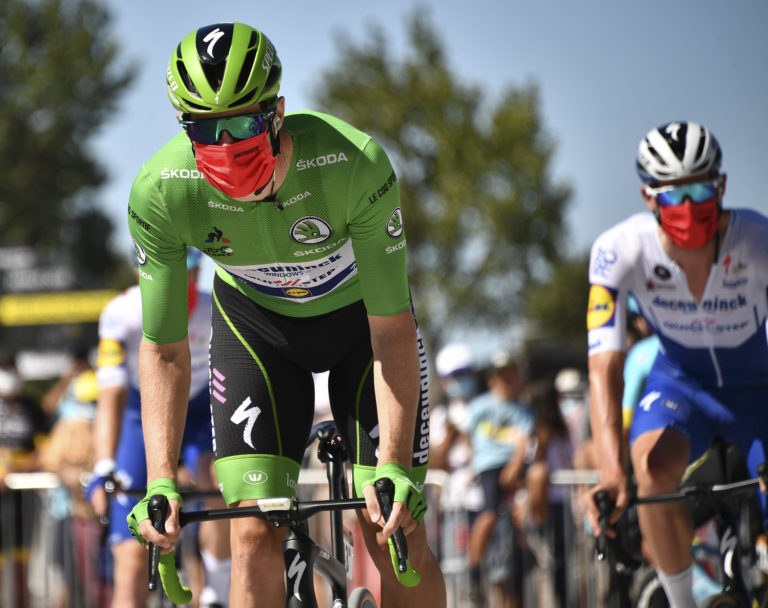 Írsky cyklista Sam Bennett v zelenom drese lídra bodovacej súťaže pred štartom 11. etapy Tour de France 2020 zo Châtelaillon Plage do Poitiersu (167,5 km). Châtelaillon Plage, 9. september 2020. Foto: Anne Christine Poujoulat/Pool via AP).