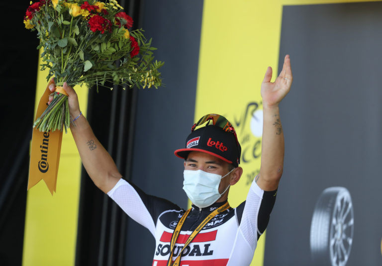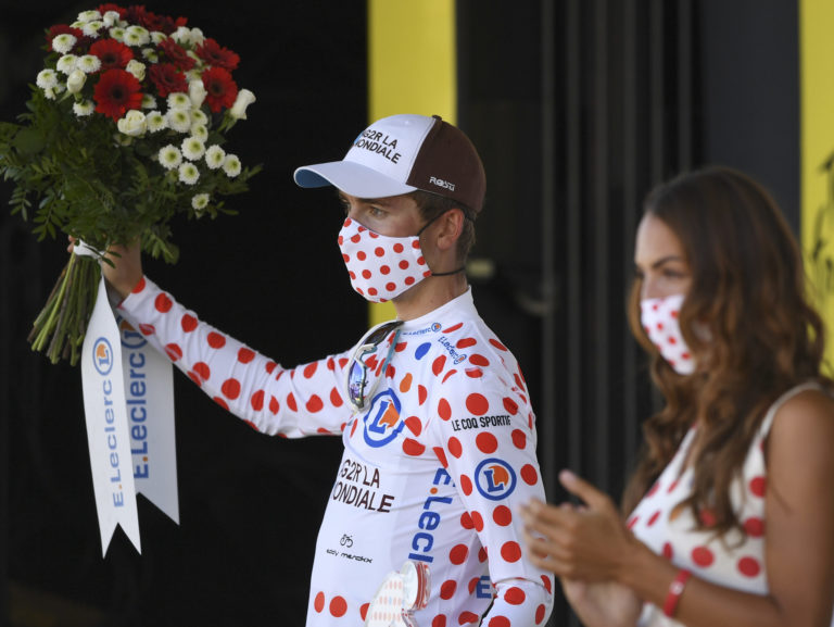 Francúz Benoit Cosnefroy v bodkovanom drese pre najlepšieho vrchára na pódiu po 11. etape Tour de France 2020 zo Châtelaillon-Plage do Poitiersu (167,5 km). Poitiers, 9. september 2020. Foto: Tim De Waele/Pool via AP.