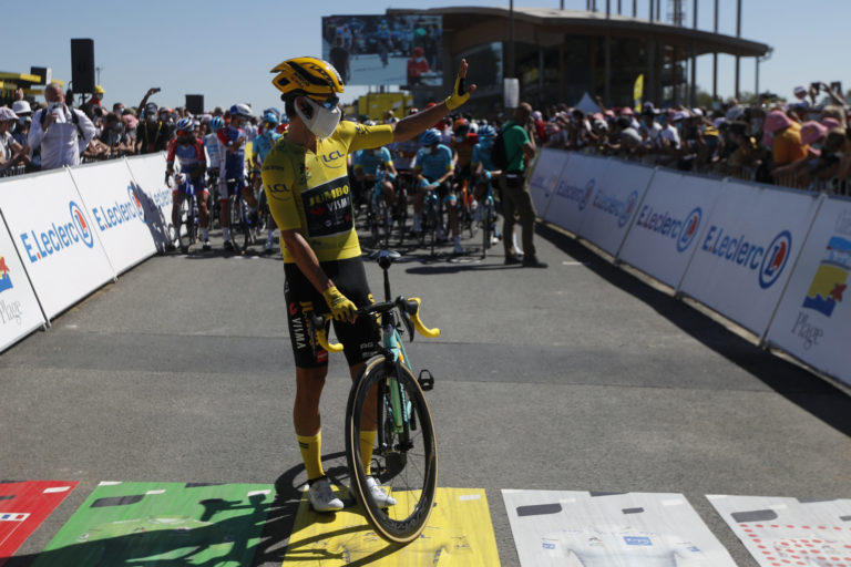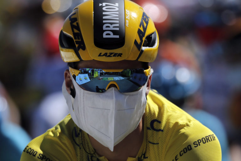 Slovinský cyklista Primož Roglič v žltom drese lídra pretekov pred štartom 11. etapy Tour de France 2020 zo Châtelaillon Plage do Poitiersu (167,5 km). Châtelaillon Plage, 9. september 2020. Foto: Anne Christine Poujoulat/Pool via AP).
