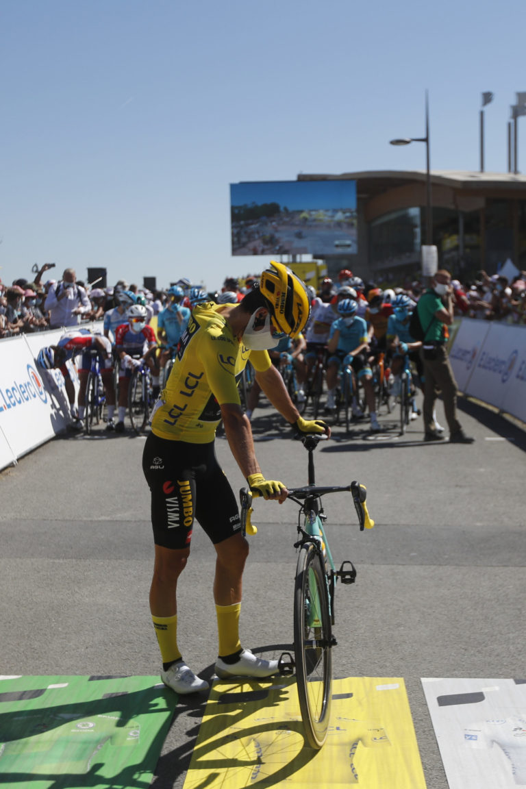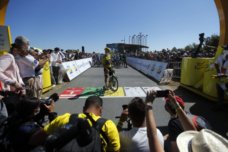 Slovinský cyklista Primož Roglič v žltom drese lídra pretekov na štarte 11. etapy Tour de France 2020 zo Châtelaillon Plage do Poitiersu (167,5 km). Châtelaillon Plage, 9. september 2020. Foto: SITA/AP:
