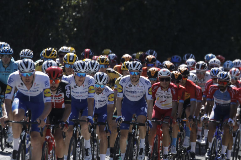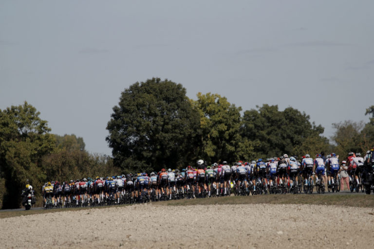 The pack rides during the eleventh stage of the Tour de France cycling race over 167 kilometers (104 miles), with start in Chatelaillon-Plage and finish in Poitiers, Wednesday, Sept. 9, 2020. (AP Photo/Christophe Ena) Foto: SITA/AP.