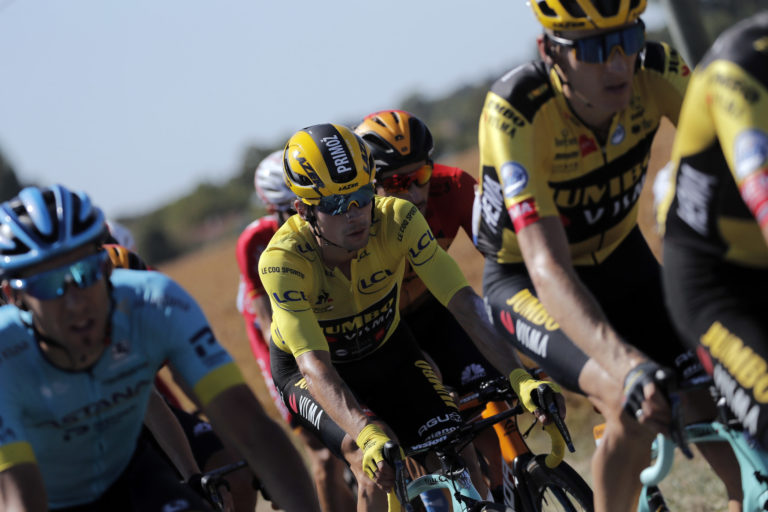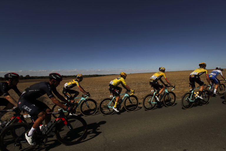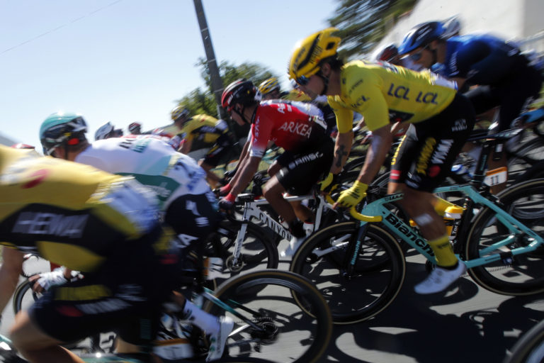 Slovenia's Primoz Roglic wearing the overall leader's yellow jersey, center, rides with the pack during the eleventh stage of the Tour de France cycling race over 167 kilometers (104 miles), with start in Chatelaillon-Plage and finish in Poitiers, Wednesday, Sept. 9, 2020. (AP Photo/Christophe Ena) Foto: SITA/AP.