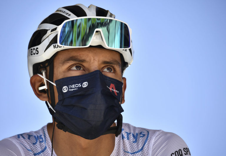 Kolumbijčan Egan Bernal v bielom drese pre najlepšieho cyklistu do 25 rokov pred štartom 11. etapy Tour de France 2020 zo Châtelaillon Plage do Poitiersu (167,5 km). Châtelaillon Plage, 9. september 2020. Foto: Anne Christine Poujoulat/Pool via AP).