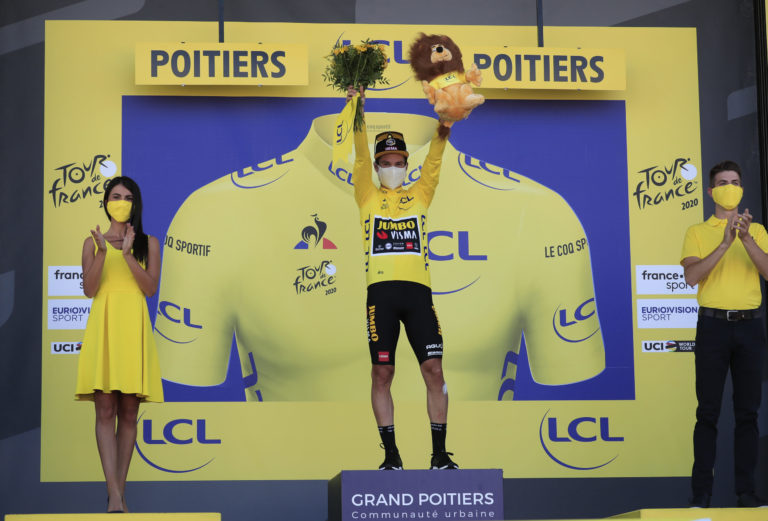 Slovinec Primož Roglič v žltom drese lídra na pódiu po 11. etape Tour de France 2020 zo Châtelaillon-Plage do Poitiersu (167,5 km). Poitiers, 9. september 2020. Foto: Christophe Petit-Tesson/Pool via AP.