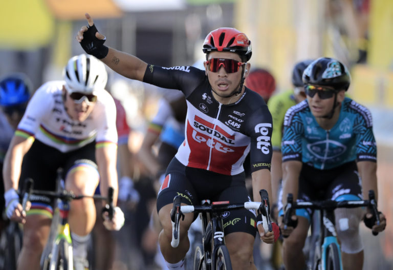 Austrálčan Caleb Ewan sa teší z triumfu v 11. etape Tour de France 2020 zo Châtelaillon-Plage do Poitiersu (167,5 km). Potiers, 9. september 2020. Foto: Christophe Petit-Tesson/Pool via AP.