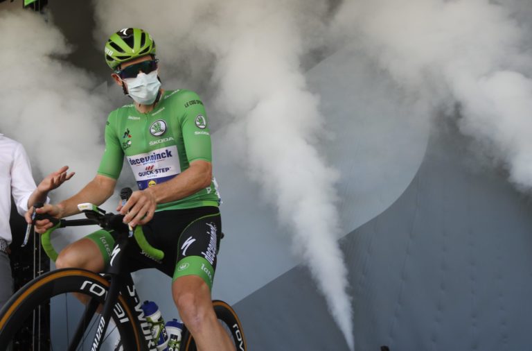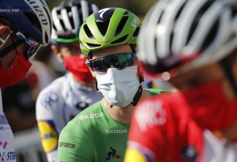Sam Bennett v zelenom drese lídra bodovacieho poradia pred štartom 17. etapy Tour de France, ktorá meria 170 km a smeruje z Grenoble do Meribel Col de la Loze. 16. september 2020 Foto: SITA/AP