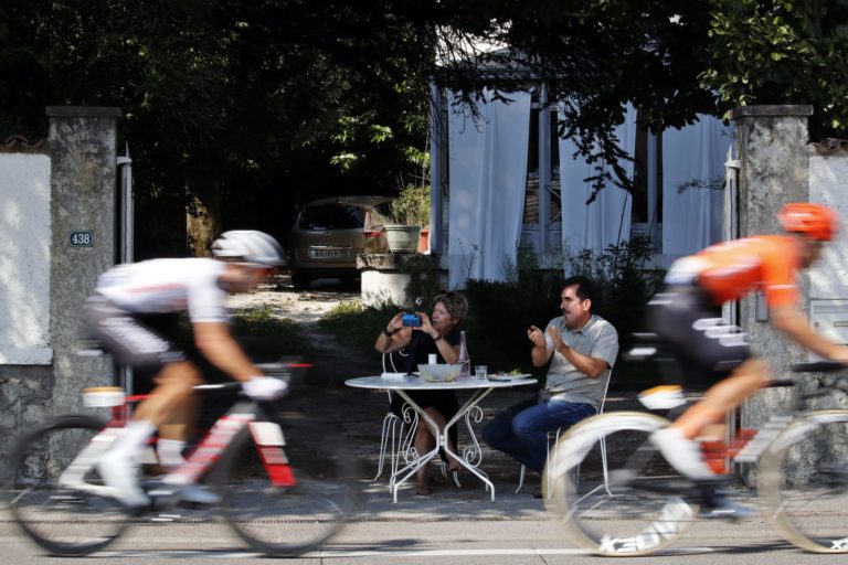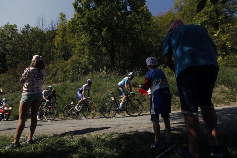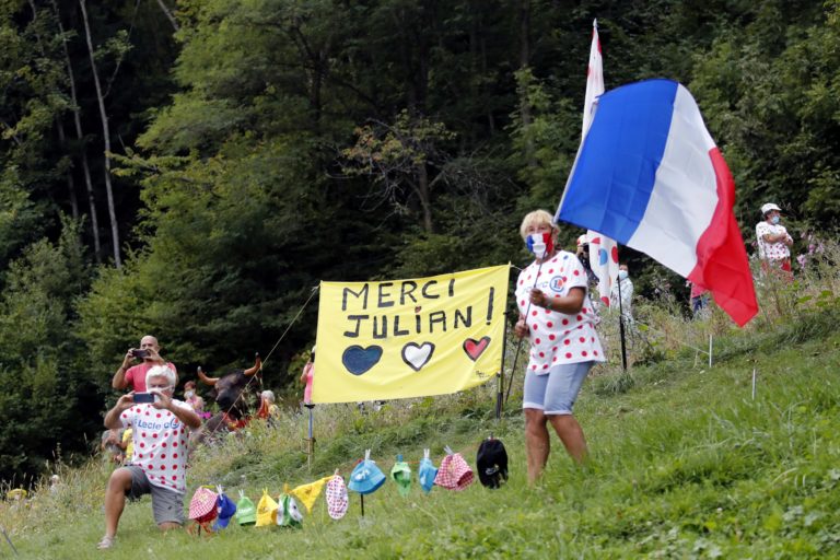Fanúšikovia sledujú jazdcov počas 17. etapy Tour de France, ktorá meria 170 km a smeruje z Grenoble do Meribel Col de la Loze. 16. september 2020 Foto: SITA/AP