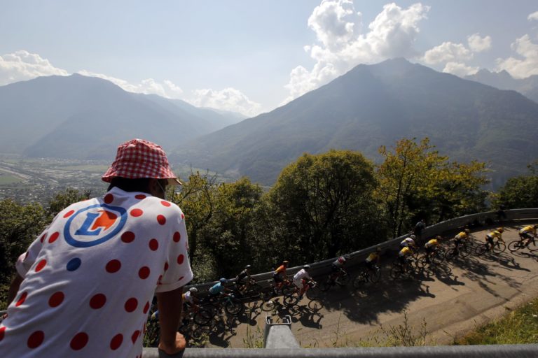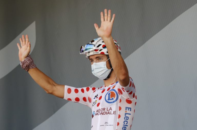 Benoit Cosnefroy v bodkovanom drese pre najlepšieho vrchára ešte pred štartom 17. etapy Tour de France, ktorá meria 170 km a smeruje z Grenoble do Meribel Col de la Loze. 16. september 2020 Foto: SITA/AP