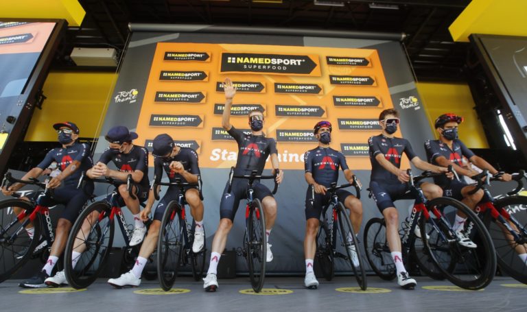 Tím Ineos bez Egana Bernala pred štartom 17. etapy Tour de France, ktorá meria 170 km a smeruje z Grenoble do Meribel Col de la Loze. 16. september 2020 Foto: SITA/AP