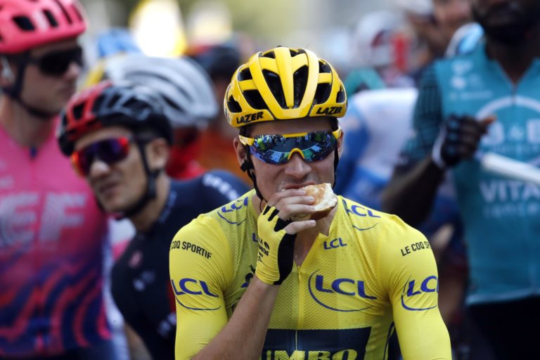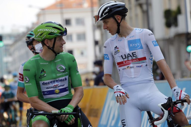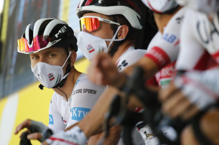 Tadej Pogacar v bielom drese pre najlepšieho mladého jazdca spolu so Samom Bennettom pred štartom 17. etapy Tour de France, ktorá meria 170 km a smeruje z Grenoble do Meribel Col de la Loze. 16. september 2020 Foto: SITA/AP