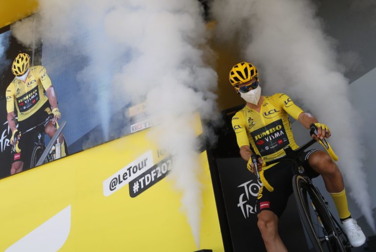 Slovinec Primož Roglič v žltom drese lídra pretekov na štarte 17. etapy Tour de France, ktorá meria 170 km a smeruje z Grenoble do Meribel Col de la Loze. 16. september 2020 Foto: SITA/AP