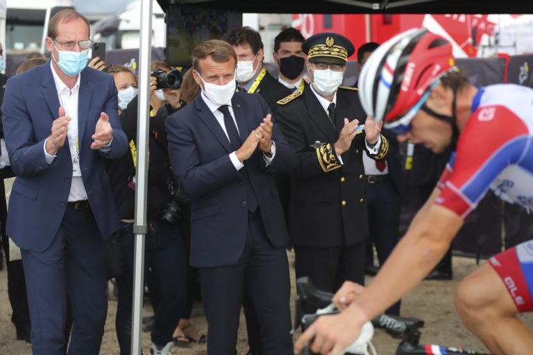 Emmanuel Macron tlieska víťazovi 17. etapy Tour de France, ktorá merala 170 km a smerovala z Grenoble do Meribel Col de la Loze. 16. september 2020 Foto: SITA/AP