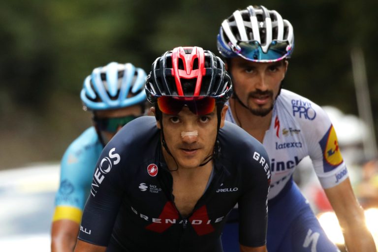 Richard Carapaz a Julian Alaphilippe počas stúpania na 17. etape Tour de France, ktorá meria 170 km a smeruje z Grenoble do Meribel Col de la Loze. 16. september 2020 Foto: SITA/AP