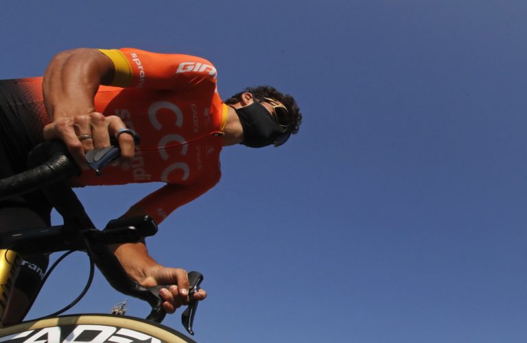 Kolumbijčan Rigoberto Uran pripravený na štarte 17. etapy Tour de France, ktorá meria 170 km a smeruje z Grenoble do Meribel Col de la Loze. 16. september 2020 Foto: SITA/AP