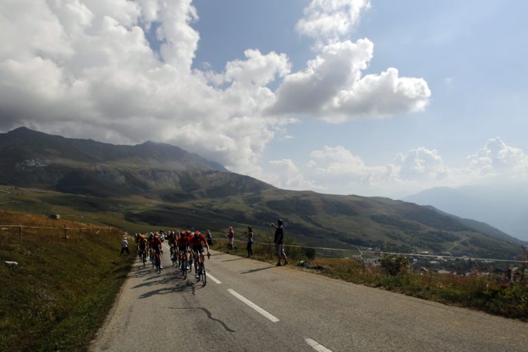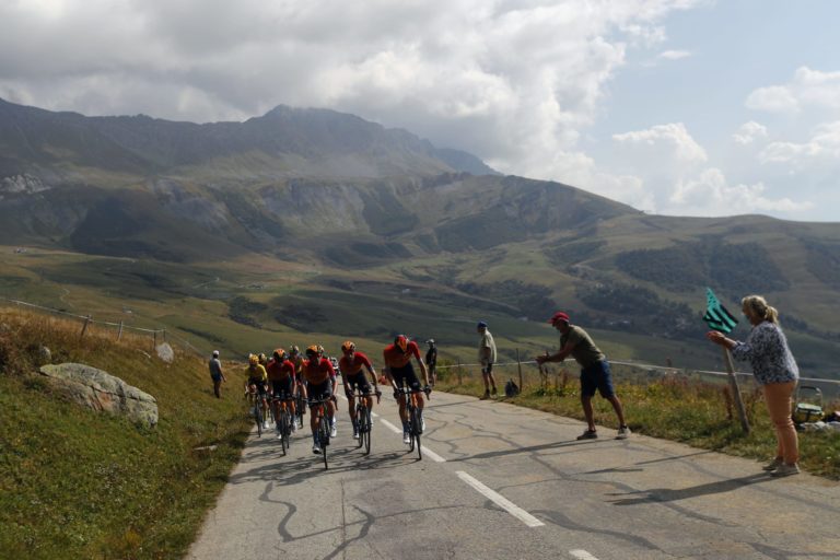 Jazdci počas 17. etapy Tour de France, ktorá meria 170 km a smeruje z Grenoble do Meribel Col de la Loze. 16. september 2020 Foto: SITA/AP