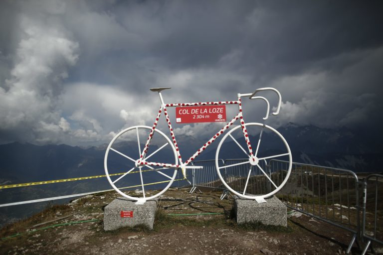 Bicykel vo farbách bodkovaného dresu pre najlepšieho vrchára Tour de France 2020 neďaleko vrcholu Col de la Loze počas 17. etapy pretekov. 16. september 2020 Foto: SITA/AP