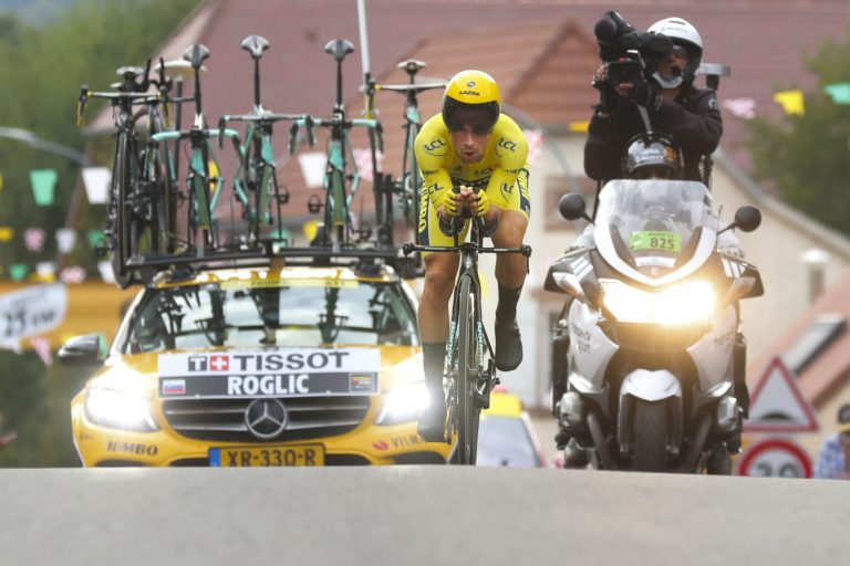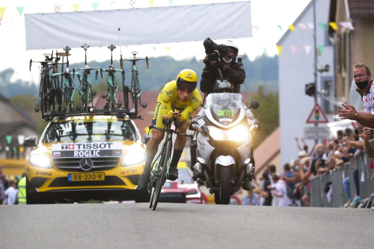 Primoz Roglic počas časovky 20. etapy Tour de France 2020, ktorá začala v Lure a končila v La Planche des Belles Filles. 19. september 2020 Foto: SITA/AP