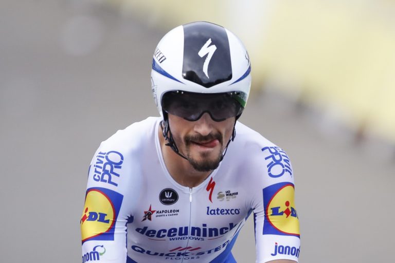 Julian Alaphilippe počas časovky 20. etapy Tour de France 2020, ktorá začala v Lure a končila v La Planche des Belles Filles. 19. september 2020 Foto: SITA/AP