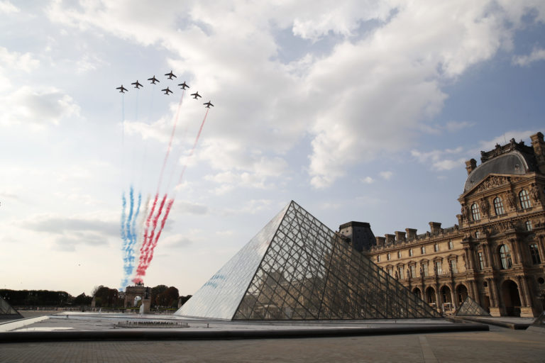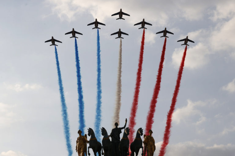 Prelet stíhačiek počas záverečnej 21. etapy s tradičným cieľom na Elyzejských poliach v Paríži. Foto: Christian Hartmann, Pool via AP.