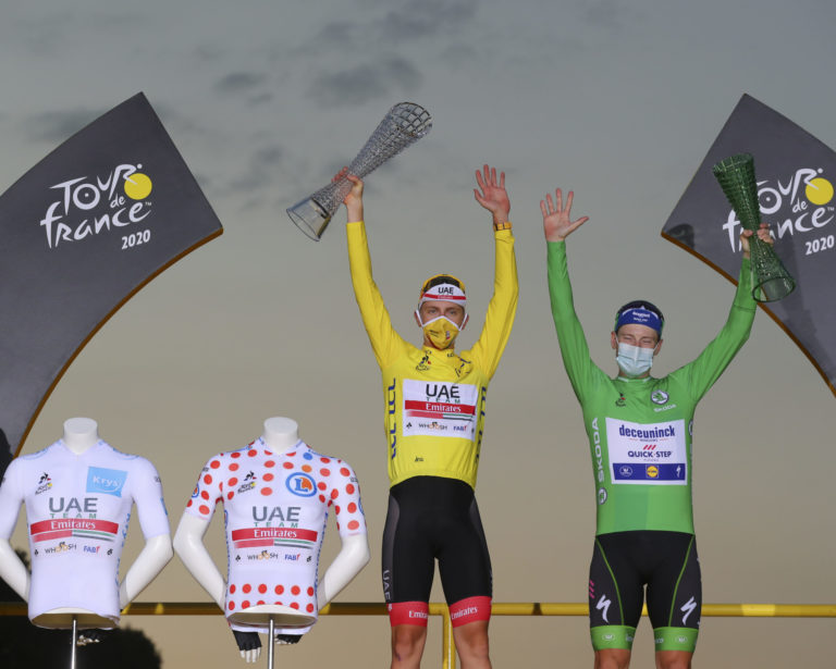 Zľava: Tadej Pogačar a Sam Bennett na pódiu po záverečnej 21. etape Tour de France 2020 s tradičným cieľom v Paríži. Foto: SITA/AP.