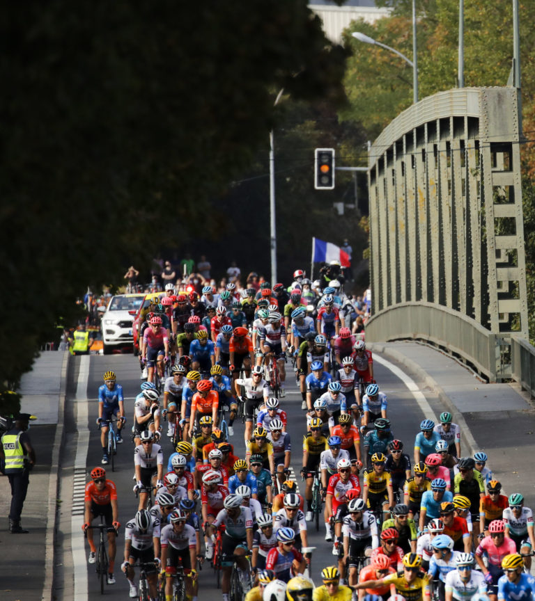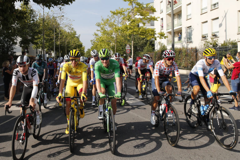 Zľava: Peter Sagan a Primož Roglič počas záverečnej 21. etapy Tour de France 2020 so štartom v Mantes la Jolie a cieľom na Elyzejských poliach v Paríži. Foto: SITA/AP.