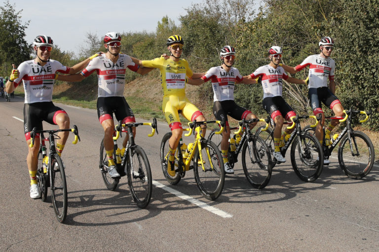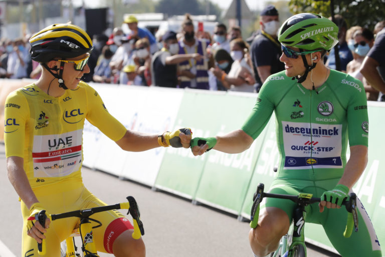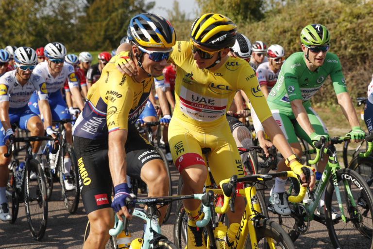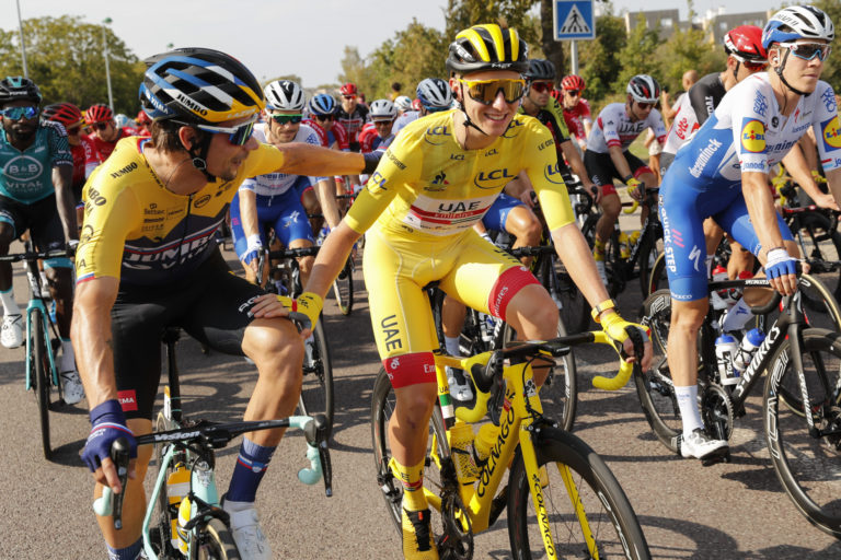Zľava: Tadej Pogačar a Sam Bennett na štarte záverečnej 21. etapy Tour de France 2020. Foto: SITA/AP.