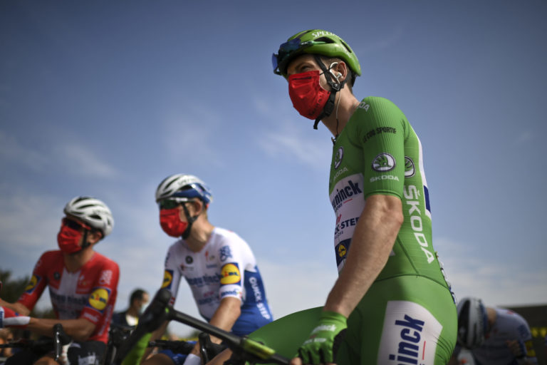 Írsky cyklista Sam Bennett v zelenom drese lídra bodovacej súťaže na štarte záverečnej 21. etapy Tour de France 2020 so štartom v Mantes la Jolie a cieľom na Elyzejských poliach v Paríži. Foto: Marco Bertorello/Pool via AP.